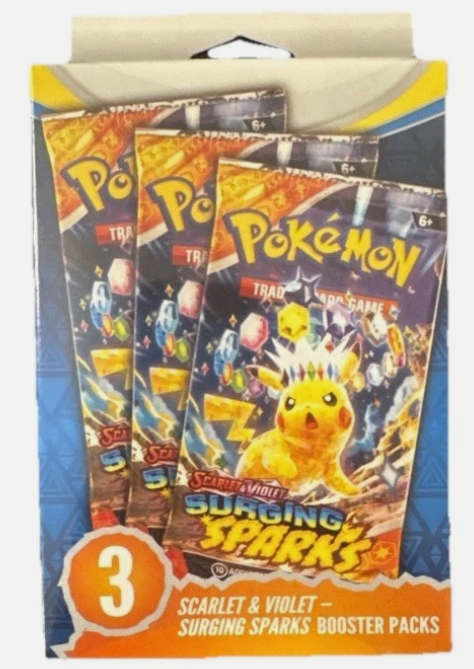 The product is a set of three factory-sealed Pokémon Trading Card Game boosters from the Surging Sparks set, featuring Pikachu as the character. Each pack contains standard-sized cards in English, manufactured by Mj Holding in 2025. Designed for ages 6 and up, these boosters offer collectors and players a chance to enhance their deck with new and exciting cards from the Pokémon TCG universe. Perfect for fans of the game looking to expand their collection or add to their playing pool.