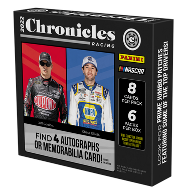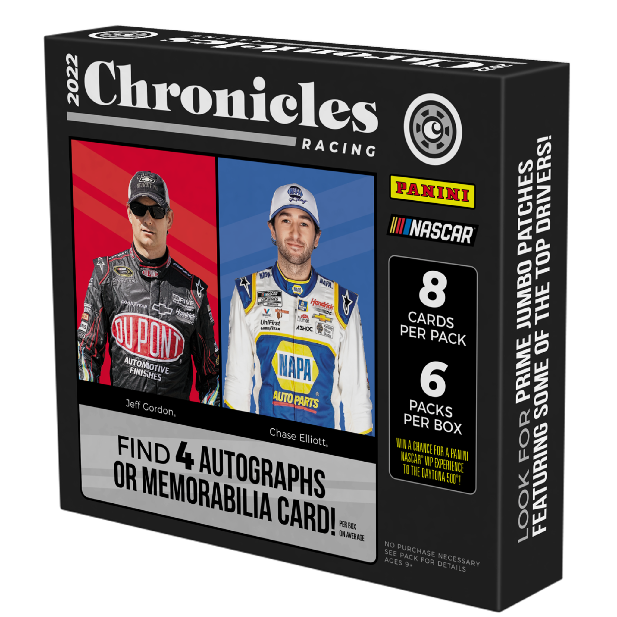 2022 Chronicles Racing features all the top drivers across multiple fan- favorite brands to give collectors numerous sets and parallels to hunt for! Look for 3 autographs and 1 memorabilia per box, on average